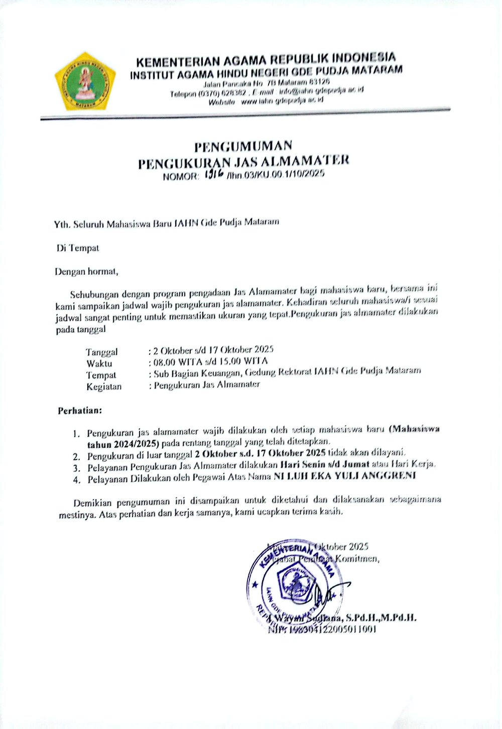 Om Swastyastu,Memperhatikan Surat dari Direktur Jenderal Bimbingan MasyarakatHindu Kementerian Agama RI, Nomor : B-128/DJ.VI/BA.03.1/10/2024 Tanggal17 Oktober 2024, Hal: Hari Libur Nasional, Libur Fakultatif, dan Cuti BersamaTahun 2025, diumumkan kepada seluruh ASN IAHN Gde Pudja Matarambahwa Hari Libur Fakutatif Hari Raya Pagerwesi jatuh pada hari Rabu Tanggal10 September 2025.