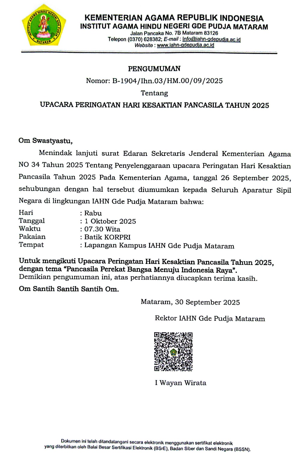 PENGUMUMAN Nomor: B-1904/Ihn.03/HM.00/09/2025 Tentang UPACARA PERINGATAN HARI KESAKTIAN PANCASILA TAHUN 2025